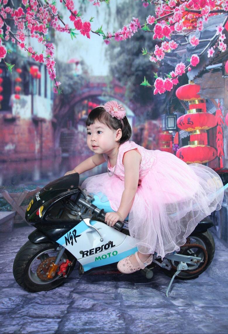 Không hiểu thợ ảnh nào đã có ý tưởng độc đáo khi để bé Trà ngồi trên mô tô chẳng khác gì một tay đua chuyên nghiệp. Mặc váy hồng mà đi xe máy thì quả là ngầu đúng không. Bức ảnh sau khi được chia sẻ đã khiến dân mạng cười ngất.
