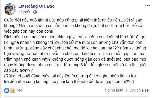 Dịch bệnh con nghỉ học bao nhiêu ngày… mà xin đón con luôn bị từ chối…điện thoại gọi không nghe, nhắn tin không trả lời… Toà xử mẹ nuôi con nhưng cha vẫn đón con bình thường… cũng cày chết cha chết mẹ để lo cho con mà? Năm xui tháng hạn vướng nợ nần nhưng vẫn lo cho con đầy đủ mà… Sao muốn gặp con mà trăm ngàn khó khăn vậy? Không được sống gần con đã thiệt thòi biết bao mỗi ngày không được nhìn con lớn… từ mùng 6 tết đến giờ con bặt vô âm tín… giờ sao đây trời?”.
