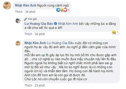 Bài đăng của Gia Bảo nhận được nhiều lời khuyên nhủ, đồng cảm, trong đó có diễn viên Nhật Kim Anh. “Cuộc đời có những con người họ ác vậy đó anh à, không nghĩ gì đến cảm giác của mình đâu. Mỗi lần em up facebook gây áp lực thì họ mới bố thí cho được gặp anh ạ…”, nữ diễn viên viết.