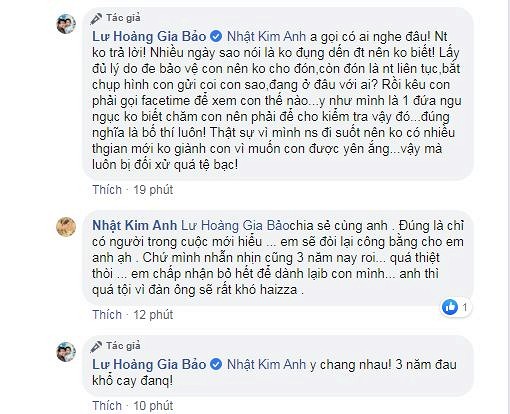 Trước những lời chia sẻ của đồng nghiệp, Gia Bảo tiếp tục cho biết: “Anh gọi có ai nghe đâu, nhắn tin không trả lời. Nhiều ngày sau nói là không đụng đến điện thoại nên không biết. Lấy đủ lý do để bảo vệ con nên không cho đón, còn đón là nhắn tin liên tục, bắt chụp hình con gửi coi con sao, đang ở đâu với ai. Rồi kêu con gọi facetime để xem con thế nào, y như mình là 1 đứa ngu ngục không biết chăm con nên phải để cho kiểm tra vậy đó… đúng nghĩa là bố thí luôn. Thật sự vì mình nói đi suốt nên không có nhiều thời gian mới không giành con vì muốn con được yên ắng… Vậy mà luôn bị đối xử quá tệ bạc”.