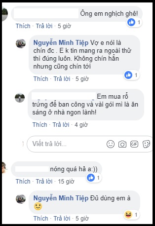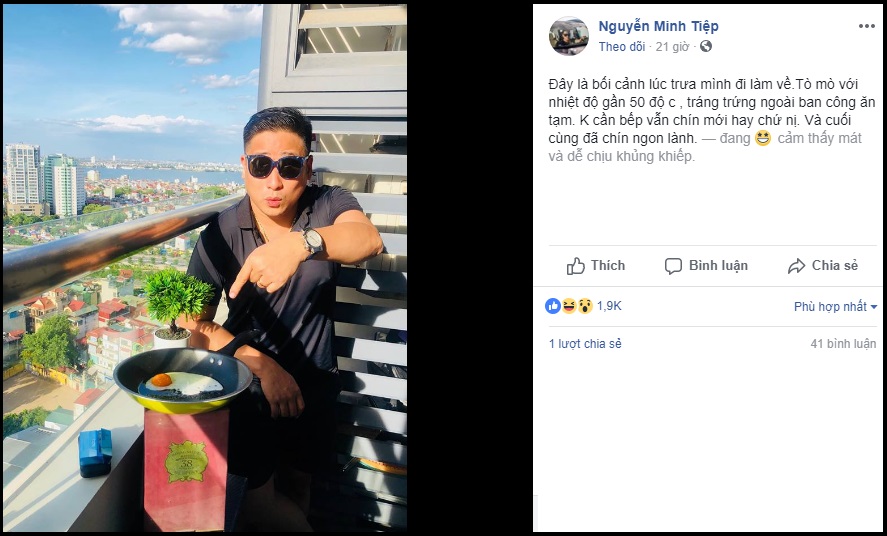 Nam diễn viên viết: ”Đây là bối cảnh lúc trưa mình đi làm về. Tò mò với nhiệt độ gần 50 độ C, tráng trứng ngoài ban công ăn tạm. Không cần bếp vẫn chín mới hay chứ. Và cuối cùng đã chín ngon lành”.