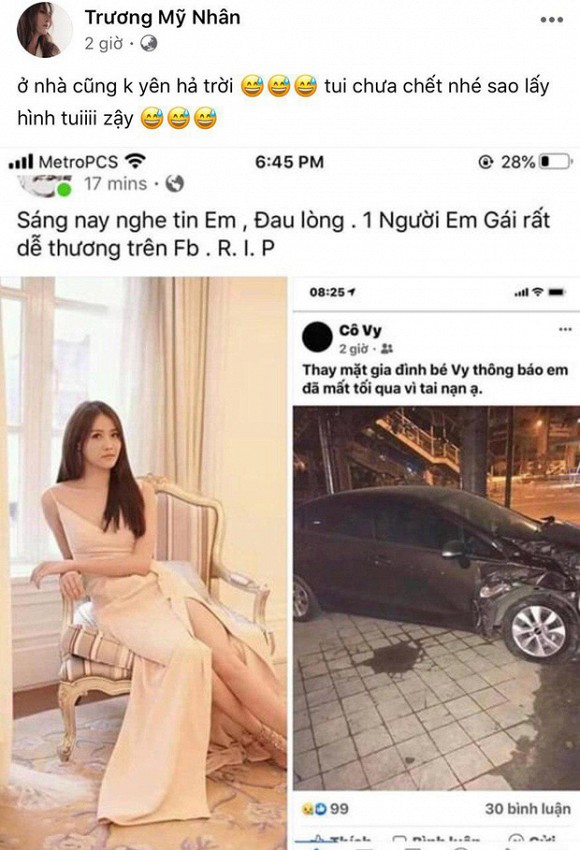Theo đó, tài khoản giấu tên chia sẻ bức ảnh của Trương Mỹ Nhân, cùng với ảnh chụp màn hình về một vụ tai nạn xe hơi, có nạn nhân tên Vy tử vong.