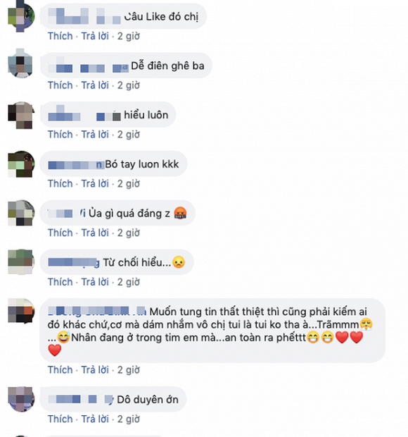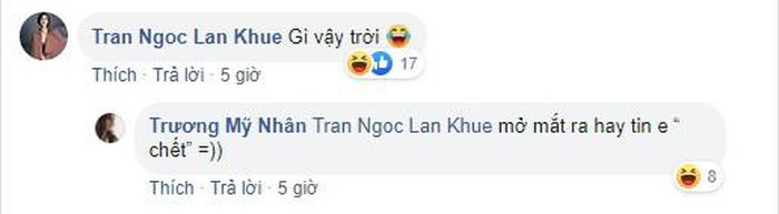 Ngay sau đó, bài viết của Trương Mỹ Nhân đã nhận được nhiều sự quan tâm của cư dân mạng. Không ít bạn bè, người hâm mộ đã bày tỏ sự phẫn nộ cho hành động “kém duyên” của tài khoản “lạ mặt” trên. Đặc biệt, người đẹp Lan Khuê cũng phải “bó tay” bình luận: “Gì vậy trời”. Đáp lại, Mỹ Nhân cho biết: “Mở mắt ra hay tin em chết”.