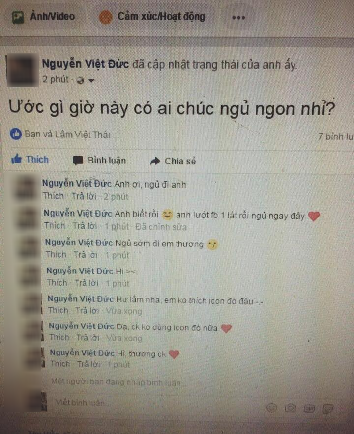 Theo hình ảnh ghi lại, tài khoản có tên Nguyễn Việt Đức đã đăng tải dòng trạng thái với nội dung: “Ước gì giờ này có ai chúc ngủ ngon nhỉ?”. Ngay lập tức phía dưới 5-6 bình luận liên tục xuất hiện với nội dung chúc chủ thớt ngủ ngon, thậm chí còn thả thính lại. Dẫu vậy những bình luận: “Anh ơi ngủ đi”, “Ngủ sớm đi em thương”, “Thương chồng”… lại do chính chủ thớt viết. Hơn nữa còn có màn đối đáp tình tứ cũng do chủ thớt tự biên tự diễn.