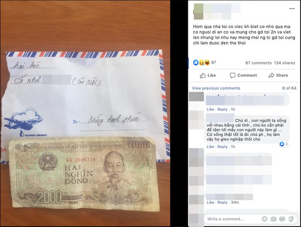 Một tài khoản O.H đã chia sẻ câu chuyện chiếc phong bì mà gia đình nhận được sau đám cưới lên mạng xã hội: “Hôm qua nhà tôi có việc, không biết là cỗ nhỏ quá mà có người đi ăn cỗ và mừng cho gia đình tôi 2 nghìn và viết lên những lời như này. Mong mọi người thông cảm, gia đình tôi cũng chỉ làm được đến thế thôi”.