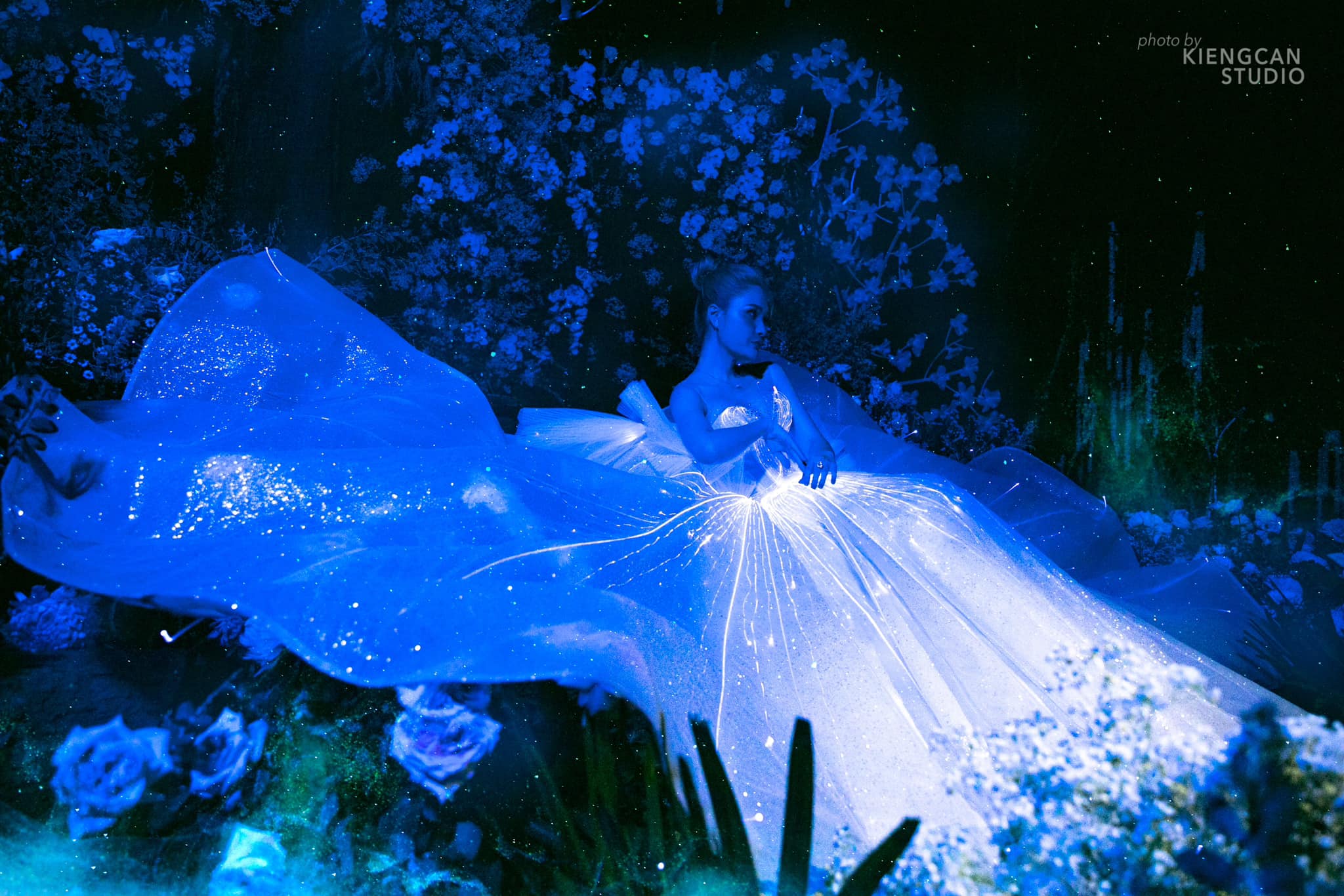 Trong không gian tối, chiếc váy của Đoàn Di Băng phát sáng mang đến hiệu ứng vô cùng lung linh và đẹp mắt. Với khung cảnh trang trí nhiều hóa tươi xung quanh, chiếc váy phát sáng càng giúp người đẹp trở nên thu hút, thậm chí còn được nhiều người khen như cô công chúa trong truyện cổ tích.