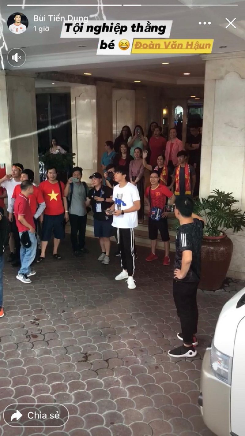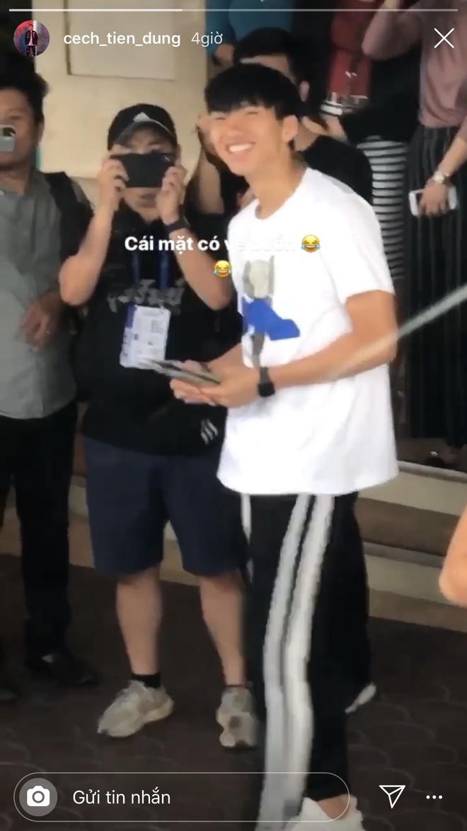 Nhiệt tình nhất có lẽ là anh em Bùi Tiến Dũng, Bùi Tiến Dụng. Dũng thì quay clip zoom cận mặt đồng đội rồi nói: “Anh rất buồn, một mình anh phải ở lại”. Sau đó, thủ thành này cũng không quên đăng lên Instagram bức ảnh Văn Hậu cười tươi rói kèm chú thích: “Cái mặt có vẻ buồn”.