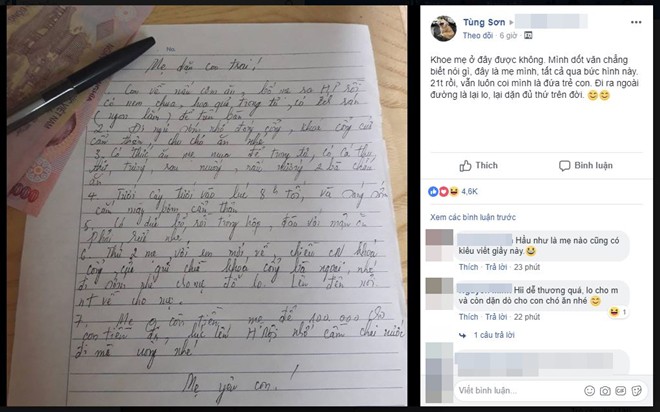 Được biết, anh chàng may mắn “sở hữu” bà mẹ chu đáo trên là Tùng Sơn, hiện đang là sinh viên trường Đại học Khoa học Xã hội và Nhân văn - Đại học Quốc gia Hà Nội. Mặc dù đi học xa nhưng cứ cuối tuần chàng trai này lại tranh thủ về nhà. Tuần này bố mẹ cậu về quê nội ở Hải Phòng nên trước khi đi mẹ đã viết giấy dặn dò anh chàng này như vậy.