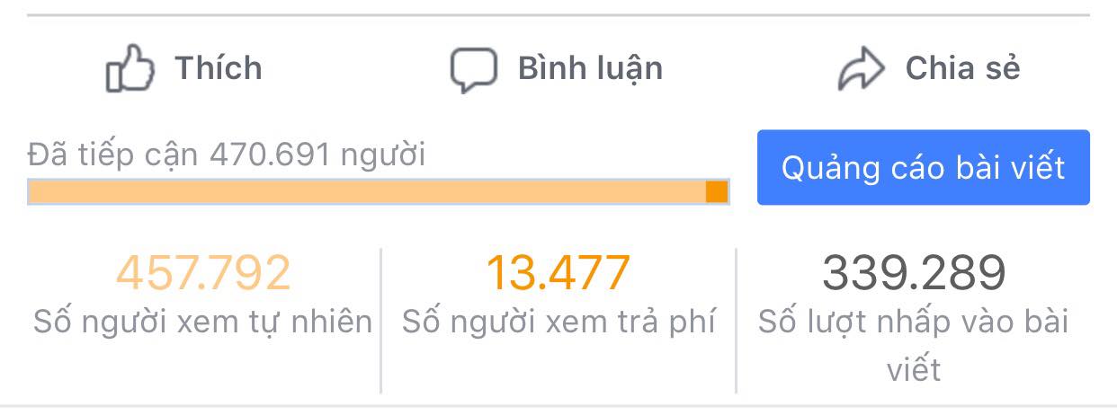 Cụ thể, kết thúc chiến dịch, anh chàng này mất 300k tiền chạy quảng cáo, thu về hơn 470 nghìn lượt tương tác, trong đó có 13.5k tương tác có trả phí và 459k tương tác tự nhiên. Tổng tương tác cho bài chạy chính: ~1.1k shares, 4.7k comment và 9k likes. Đây là một con số ấn tượng và đáng mơ ước của bất kỳ shop online nào khi tham gia chạy quảng cáo trên Facebook