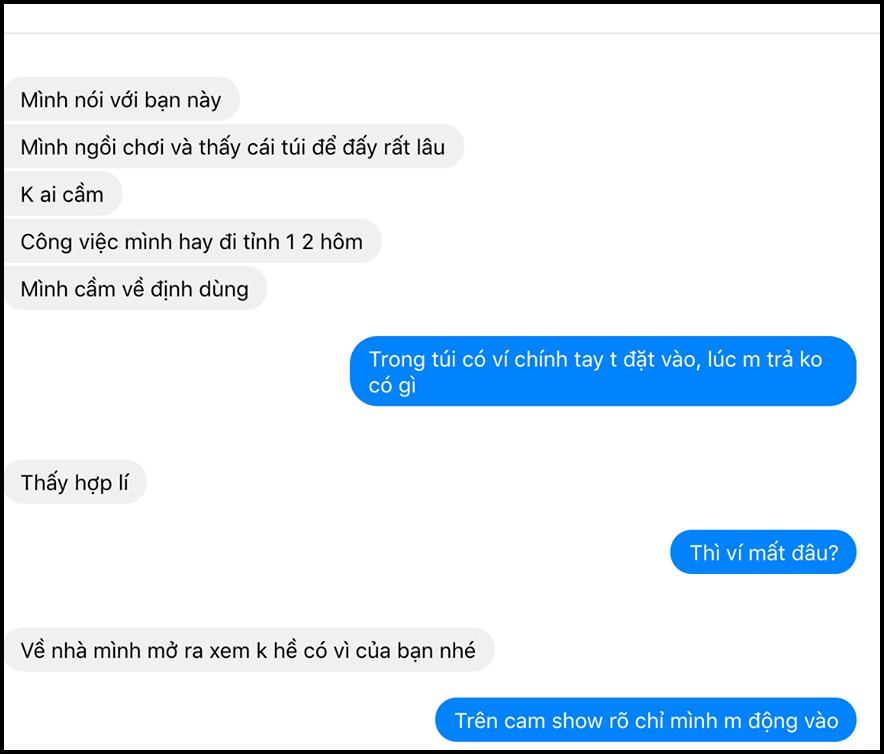Hôm sau thấy anh chủ gọi báo nó chỉ trả túi và chối không có ví nào trong đó. Mình liên hệ Facebook nó thì nó liên tục chối, thậm chí tráo trở nói rằng thấy túi ở đó thì tiện tay cầm về, và trong túi không có ví.