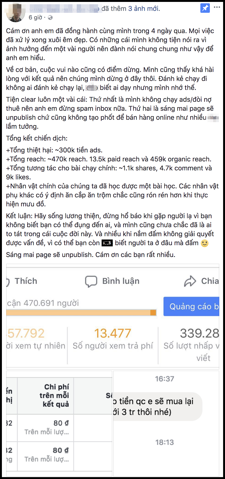 Tiện clear luôn một vài cái: Thứ nhất là mình không chạy ads/đòi nợ thuê nên anh em đừng spam inbox nữa. Thứ hai là sáng mai page sẽ unpublish chứ cũng không tạo phốt để bán hàng online như nhiều người lầm tưởng. Hãy sống lương thiện, đừng hổ báo khi gặp người lạ vì bạn không biết bạn có thể đụng đến ai, và mình cũng chưa chắc đã là ai to tát trong cái cuộc đời này. Và nhiều khi nắm đấm không giải quyết được vấn đề, vì có thể bạn còn không biết người ta ở đâu mà đấm. Sáng mai page sẽ unpublish. Cám ơn các bạn rất nhiều”