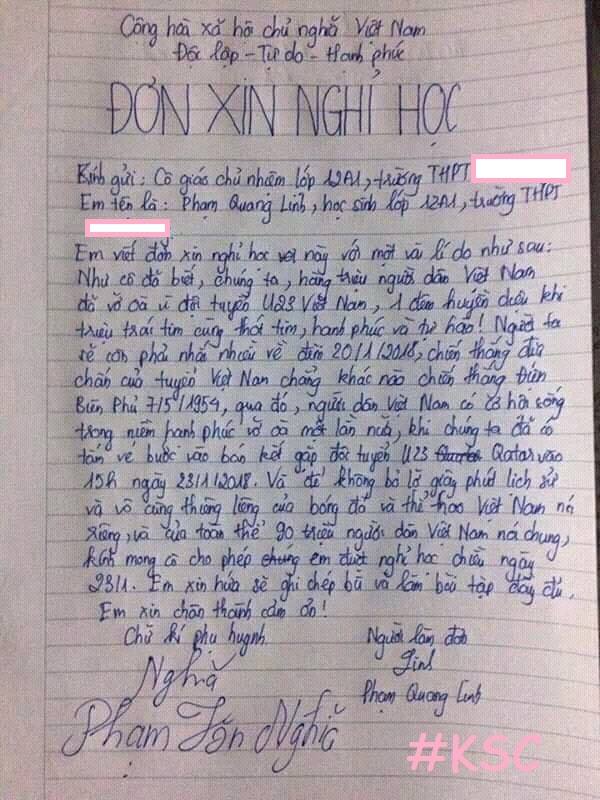 Đơn xin nghỉ học kèm luôn chữ ký phụ huynh của 1 fan bóng đá.