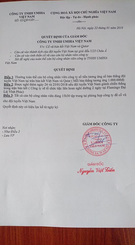 Các công ty chơi lớn, thưởng ngay cho nhân viên nếu tuyển U23 Việt Nam đá thủng lưới đội bạn, mỗi bàn thắng tương đương 1 triệu đồng!!!