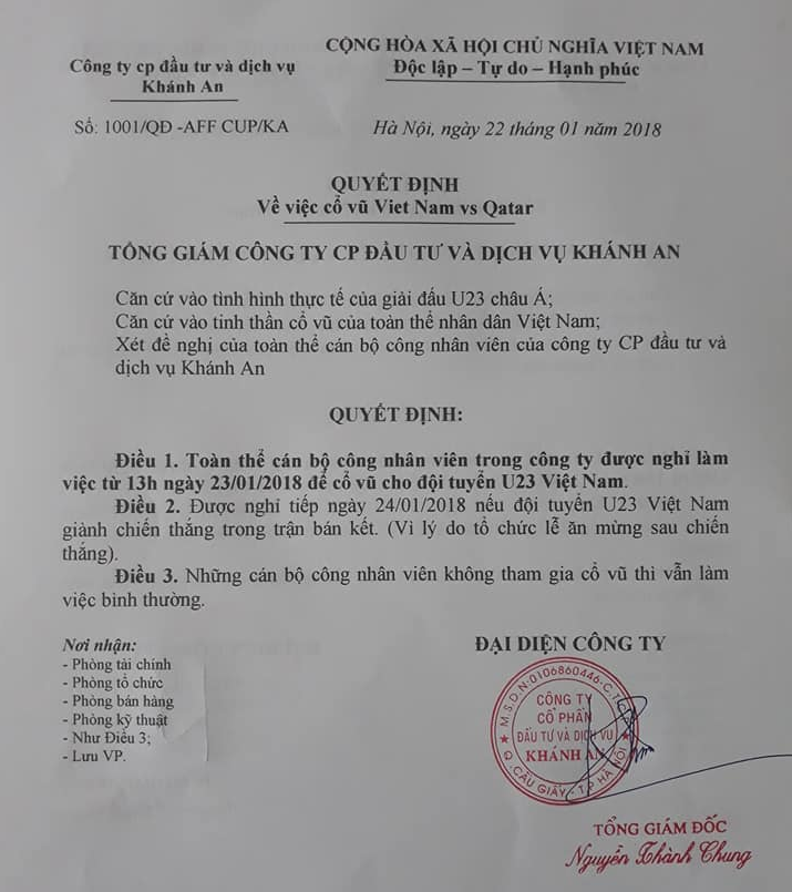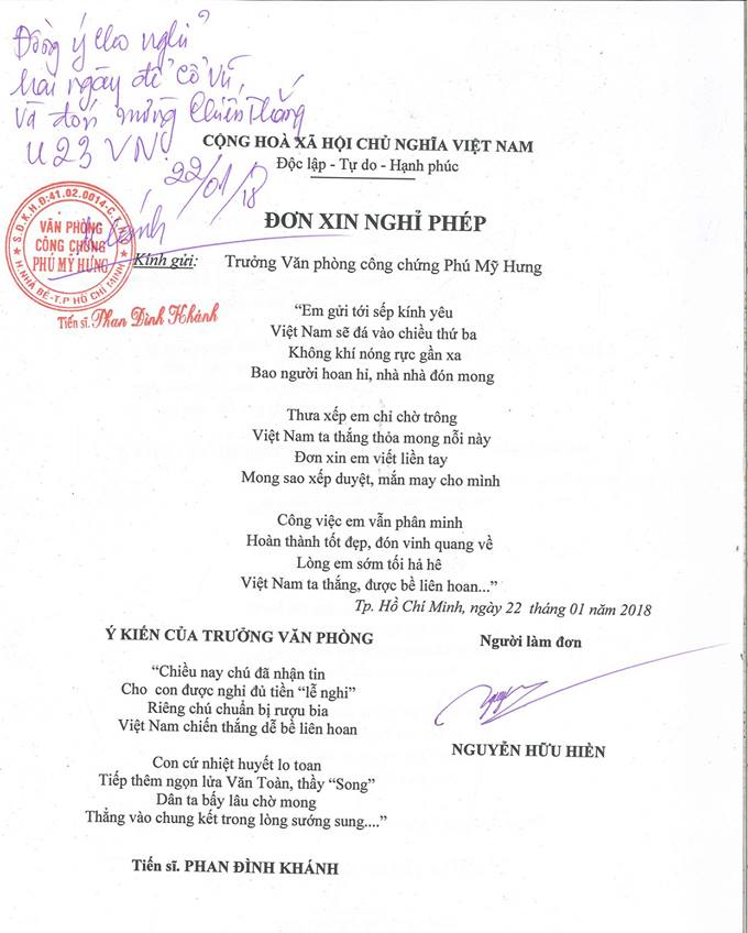 Đặc biệt, nhân viên này còn làm cả thơ lục bát để xin nghỉ, cổ vũ cho đội tuyển U23 Việt Nam!