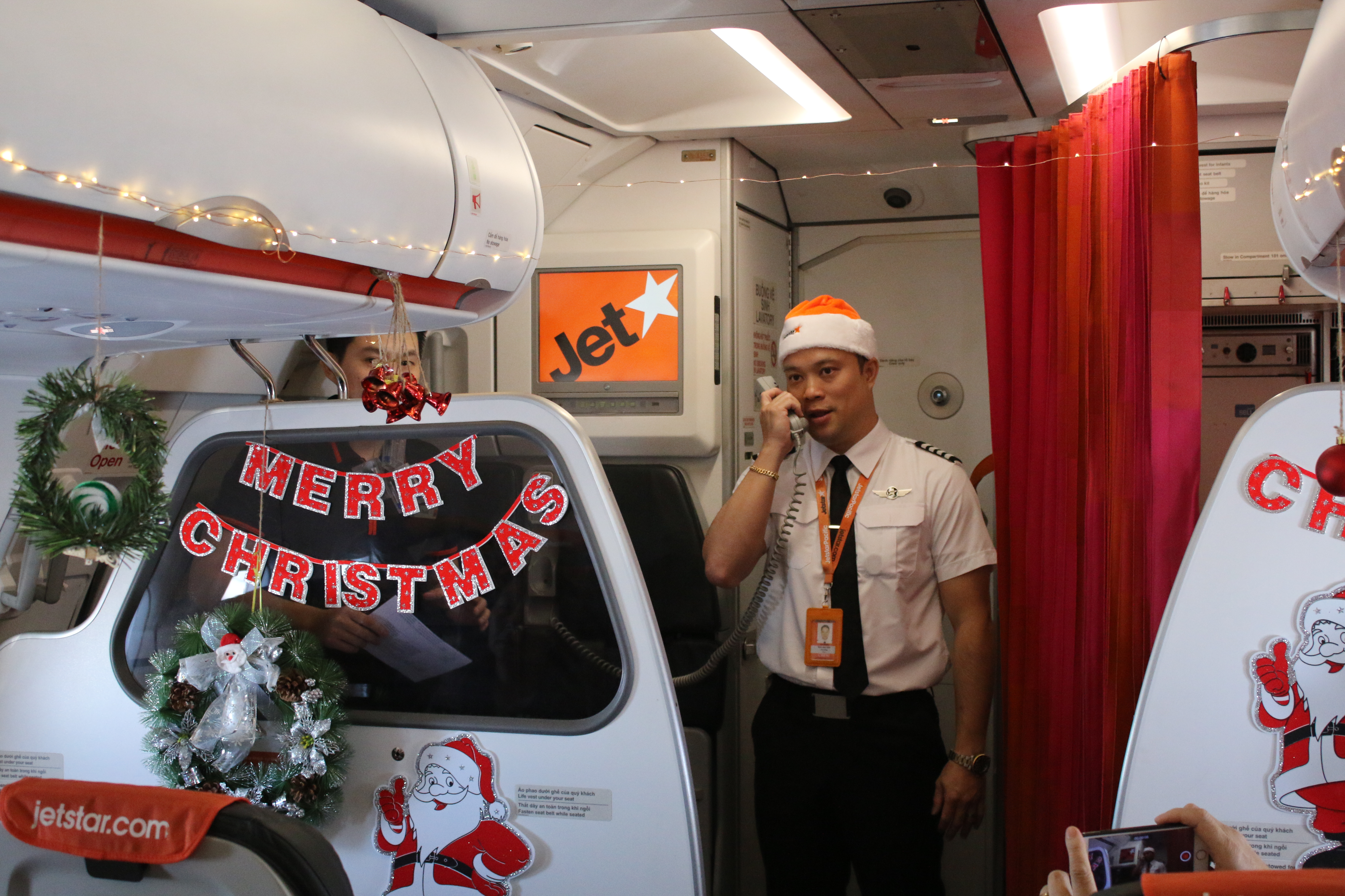 Cơ trưởng khách mời Trần Thiên Viên chào đón hành khách có mặt trên chuyến bay đặc biệt nhân dịp Giáng Sinh của Jetstar.