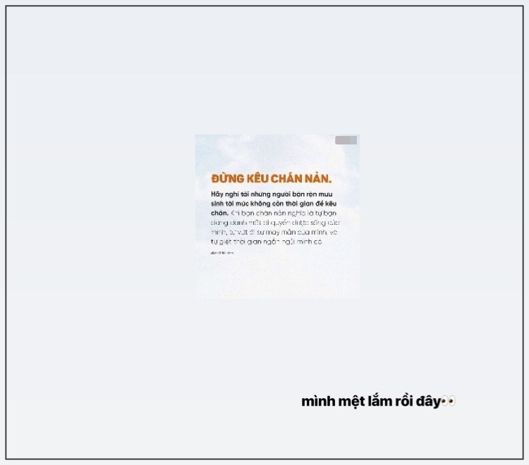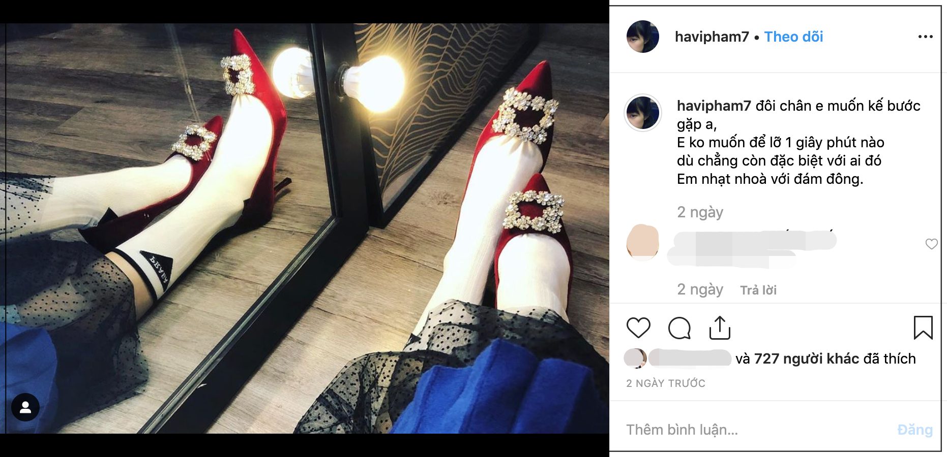 Trước đó, cô nàng cũng đăng ảnh chụp đôi chân đang mang một đôi giày cao gót màu đỏ rất sang chảnh và viết: 'Đôi chân em muốn kế bước gặp anh. Em không muốn để lỡ một giây phút nào. Dù chẳng còn đặc biệt với ai đó. Em nhạt nhoà với đám đông', đi kèm là một story cũng tâm trạng không kém.