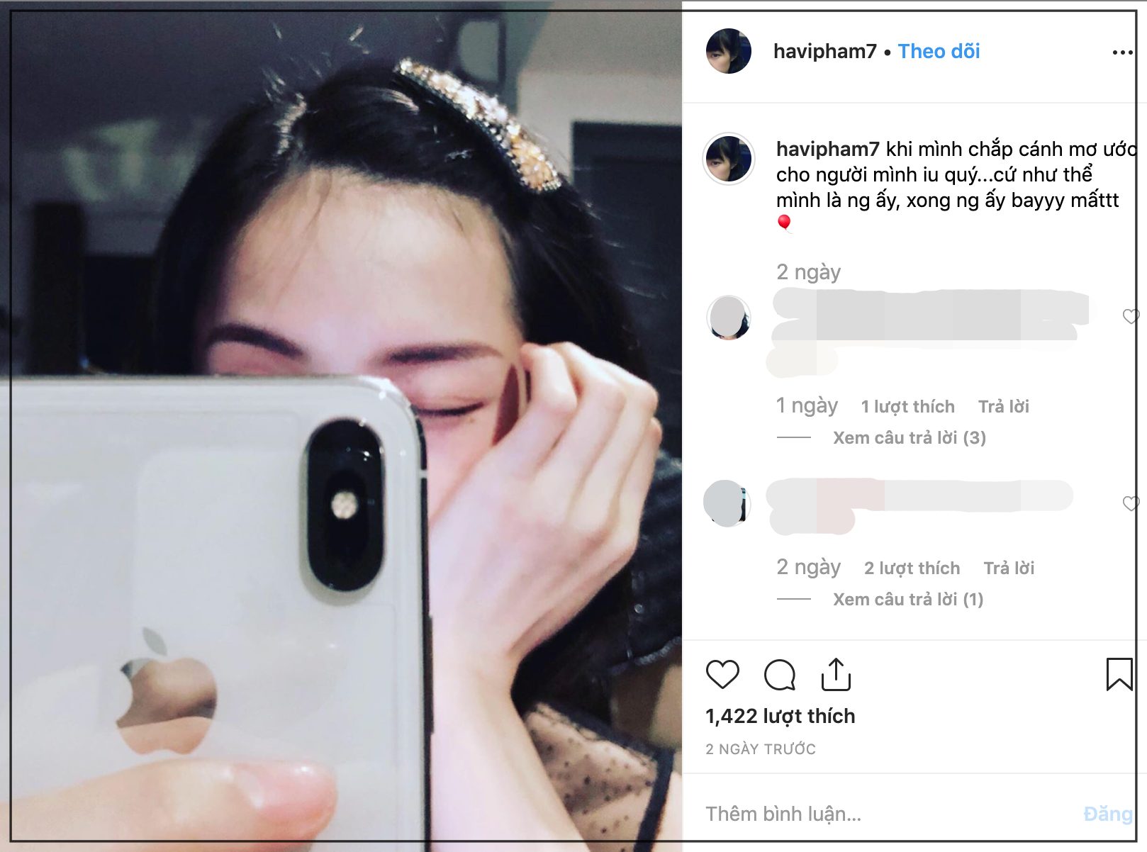 Nhưng bên cạnh đó, người ta cũng soi được việc cách đây vài ngày, Hạ Vi có một số dòng trạng thái khá tâm trạng trên Instagram của mình. Cô đăng ảnh che mặt và chia sẻ ẩn ý: 'Khi mình chắp cánh mơ ước cho người mình yêu quý… Cứ như thể mình là người ấy, xong người ấy bay mất'.