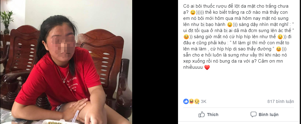 Cụ thể, câu chuyện là cô em gái vì muốn có làn da trắng sáng nên đã dùng rượu thuốc để bôi. Tuy nhiên, chỉ sau một đêm, làn da của cô gái đỏ ửng, sưng lên như bị đánh và mắt húp lại. Bức ảnh khiến dân tình vừa buồn cười, vừa thương cho sự dại dột của cô gái.