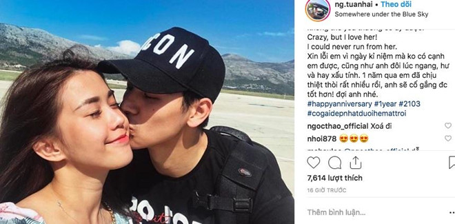 Vốn được người hâm mộ vô cùng yêu thích bởi chuyện tình lãng mạn, mới đây, anh chàng Tuấn Hải, bạn trai của hot girl Ngọc Thảo tỏ tình công khai với cô trên mạng xã hội thông qua hình ảnh cặp đôi tình tứ cùng dòng chia sẻ: “Cô ấy là kiểu con gái cứng đầu nhưng mạnh mẽ, rất là bướng bỉnh đến mức nếu không có kiên nhẫn, sẽ không thể yêu thương cô ấy được. Crazy, but I love her! I could never run from her. Xin lỗi em vì ngày kỉ niệm mà không có cạnh em được, cũng như anh đôi lúc ngang, hư và hay xấu tính. 1 năm qua em đã chịu thiệt thòi rất nhiều rồi, anh sẽ cố gắng được tốt hơn! Đợi anh nhé“.