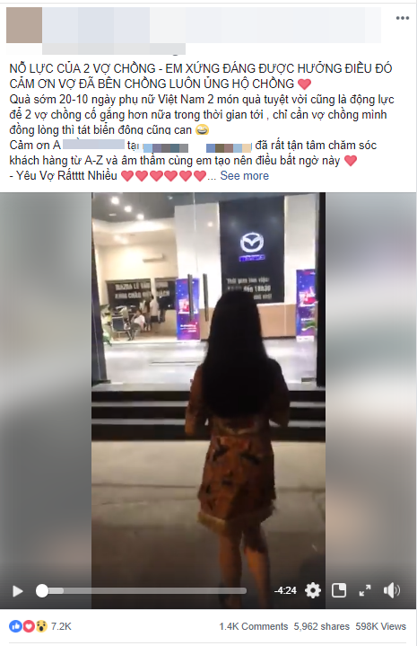 Đến lúc này, anh chồng mới xuất hiện trong hình và dịu dàng nói với vợ mình: “Ừ, anh làm thủ tục, xong hết rồi, xe tặng vợ đấy!”.