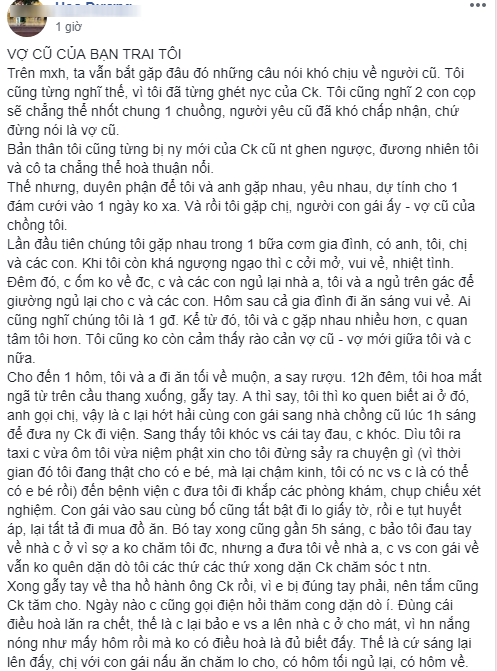 Nguyên văn chia sẻ của Hoa: “Trên mạng xã hội, ta vẫn bắt gặp đâu đó những câu nói khó chịu về người cũ. Tôi cũng từng nghĩ thế, vì tôi đã từng ghét người yêu cũ của chồng. Tôi cũng nghĩ 2 con cọp sẽ chẳng thể nhốt chung 1 chuồng, người yêu cũ đã khó chấp nhận, chứ đừng nói là vợ cũ.
