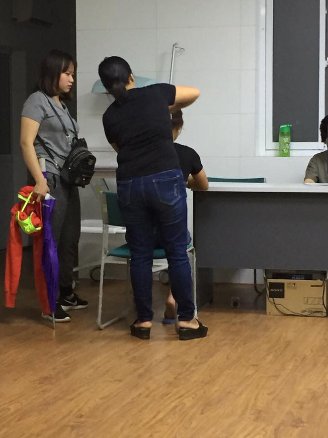 Bức ảnh vợ cũ cùng con gái của chồng đang buộc tóc, chăm sóc cho Hoa ngày cô bị gãy tay, nằm viện. (Ảnh: NVCC)
