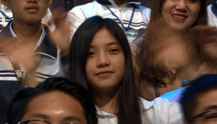 Không quá khó để tìm ra được thông tin về cô gái này. Đó là Nguyễn Thị Thúy Ngân (sinh năm 1999, từng học chuyên Sử tại trường THPT chuyên Hùng Vương, TP. Việt Trì, Phú Thọ). Hiện tại, Ngân là sinh viên năm nhất ngành Quản trị Du lịch của ĐH Khoa học xã hội và Nhân văn (TP.HCM). Ngân đến trường quay để cổ vũ cho thí sinh Trần Nguyễn Nhất Tín - người đã giành vòng nguyệt quế.