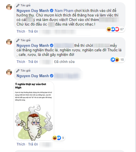 Thông qua những bình luận qua lại với người hâm mộ, Duy Mạnh thể hiện quan điểm trái ngược với Lưu Hương Giang. Anh cho rằng việc sử dụng chất gây nghiện là chuyện cá nhân của nghệ sĩ, không nên bàn luận, miễn là họ không làm ảnh hưởng đến ai. Thêm vào đó, nam ca sĩ còn sử dụng hình ảnh thuật ngữ về từ Get High của giới trẻ khiến nhiều người cho rằng anh đang “cà khịa” Lưu Hương Giang vì trước đó, nữ ca sĩ đã phát hành 1 MV có tên Get High