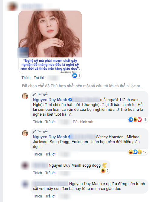 Mới đây, khi được một cư dân mạng hỏi ý kiến về phát ngôn của Lưu Hương Giang, Duy Mạnh đã thẳng thắn bày tỏ: “Mỗi người 1 lĩnh vực. Nghệ sĩ thì chỉ nên hát thôi, chứ nghệ sĩ lại đi bàn chính trị, rồi lại còn bàn luận cả vấn đề của bọn nghiện nữa ..! Thế hoá ra là nghệ sĩ biết tuốt hả..?”.