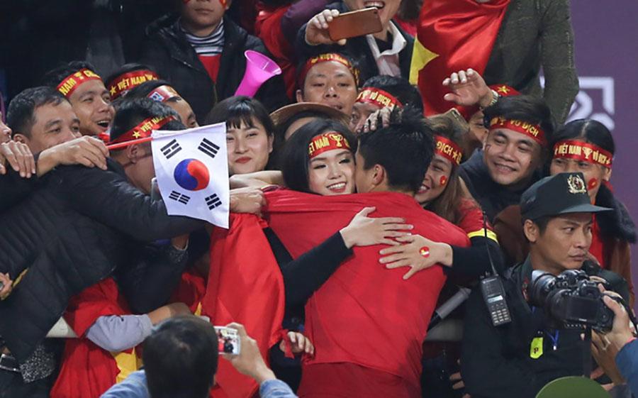Hình ảnh Duy Mạnh trao huy chương cho bạn gái và dành cái ôm hôn ấm áp trong trận chung kết AFF vừa qua.