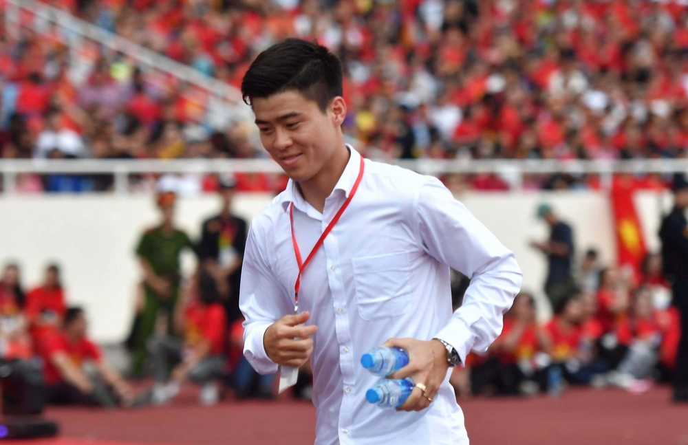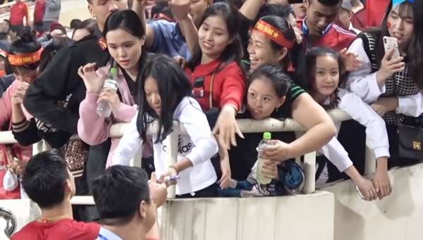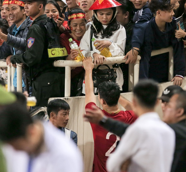 Trận đấu kết thúc, khi đã ăn mừng với đồng đội xong xuôi, Duy Mạnh đã nhanh chóng chạy ra khán đài tìm mẹ và bạn gái. Anh chàng luôn mang sẵn hai chai nước cho hai người phụ nữ quan trọng nhất cuộc đời mình.