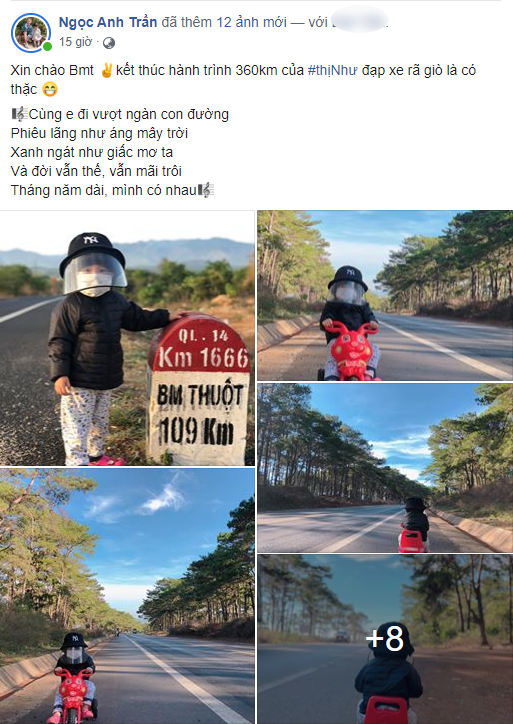 Đến cột mốc Buôn Mê Thuột 109 km thì cả gia đình dừng lại để chụp cho con gái tấm ảnh kỷ niệm chuyến đi phượt đầu tiên trong đời. Còn chiếc xe đạp 3 bánh hình chú thỏ là món đồ mà chơi ba mẹ đã mua cho Như trên quãng đường di chuyển hàng trăm cây số. Khi dừng lại để chụp hình thì cô bé rất háo hức và đòi chạy thử chiếc xe đạp 3 bánh ngay lập tức. Kết quả là bộ ảnh đi phượt đầu tiên của Quỳnh Như đã ra đời. Những khoảnh khắc bình dị mà hết sức dễ thương của cô bé gần 3 tuổi đã “đốn tim” không ít người xem.