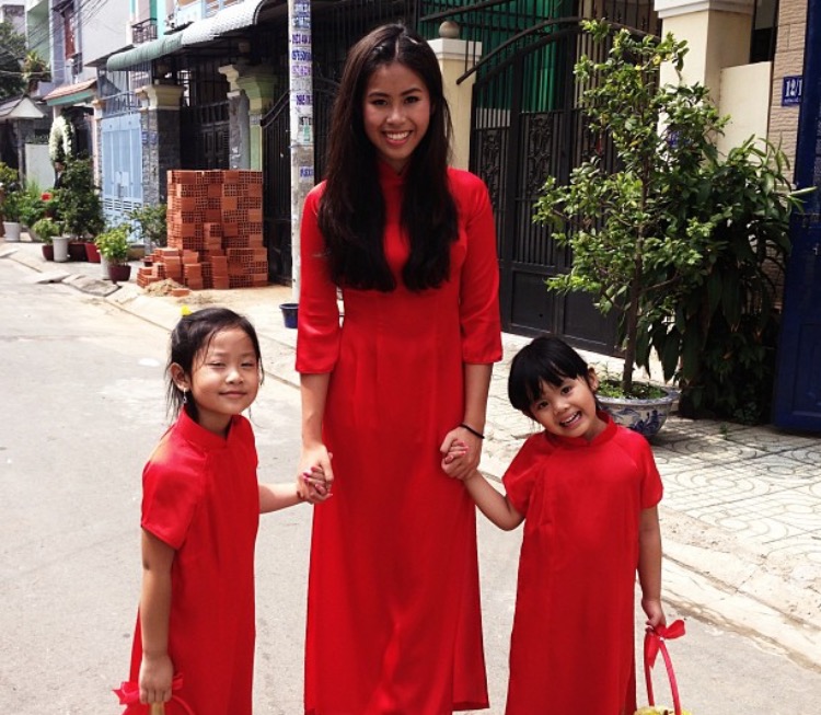 Vô cùng duyên dáng với tà áo dài đỏ.