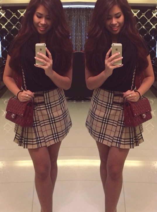 Đỏm dáng với chiếc váy kẻ caro phối cùng chiếc áo thun đen đơn giản.
