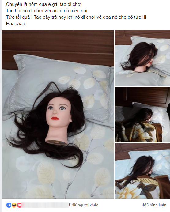 Nguyên văn bài đăng cô gái viết: ”Chuyện là hôm qua em gái mình đi chơi. Mình hỏi nó đi chơi với ai thì nó không nói. Tức tối quá mình bày trò này khi nó đi chơi về dọa nó cho bõ tức!'.