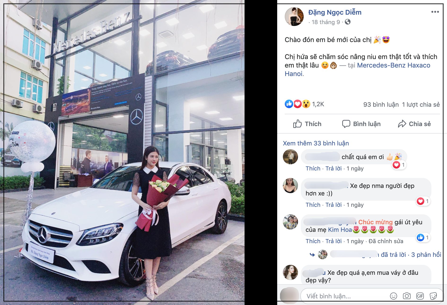 Trên trang cá nhân, cô chia sẻ bức ảnh chụp với xế sang mới tậu - chiếc Mercedes-Benz, có giá gần 2 tỷ đồng kèm caption: “Chào đón em bé mới của chị. Chị hứa sẽ chăm sóc nâng niu em thật tốt và thích em thật lâu”. Bên dưới bài viết, dân tình đã ào ào chúc mừng cô nàng. Có người còn tag mẹ của Ngọc Diễm vào để bày tỏ sự ganh tỵ khi bà có hai cô con gái thật giỏi giang.
