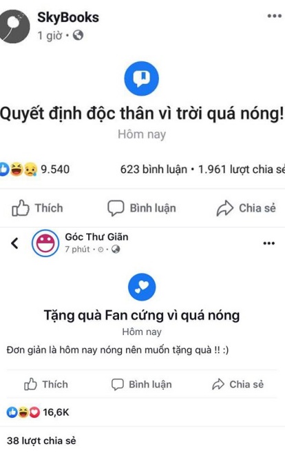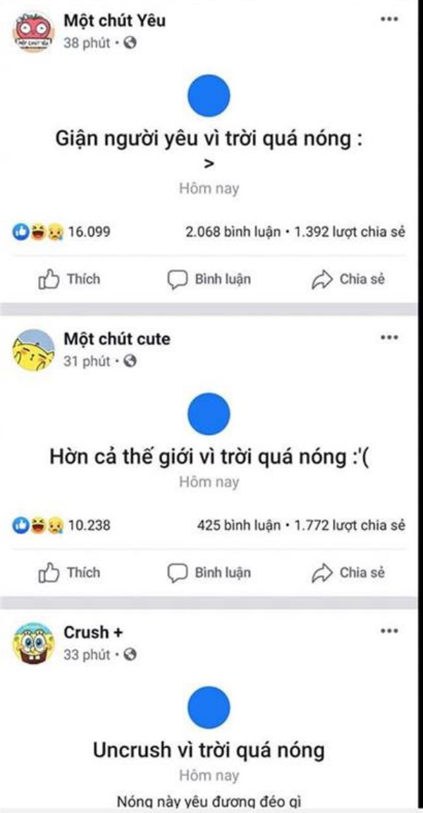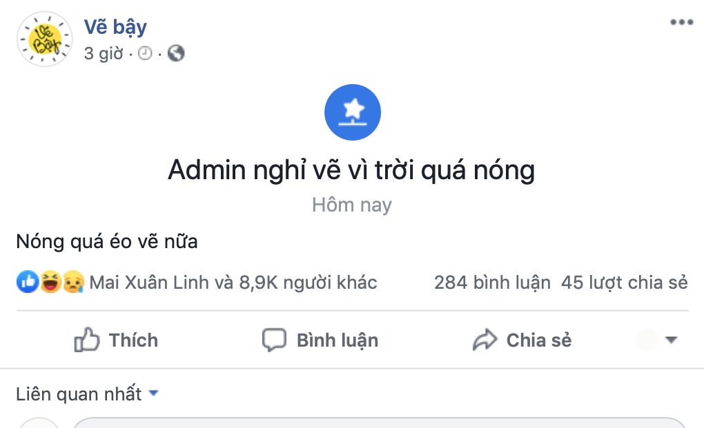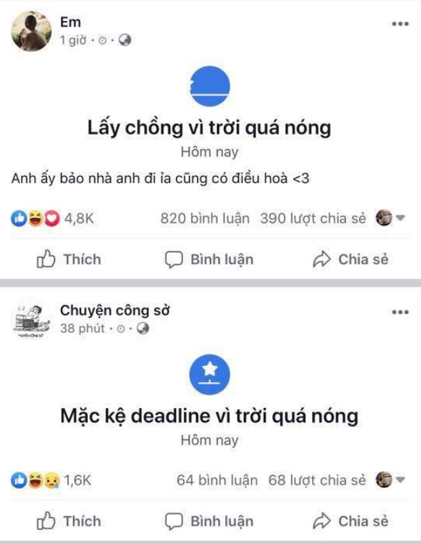 Mới đây, trên mạng xã hội, hàng loạt fanpage nổi tiếng Facebook đã cùng nhau lên tiếng đình công, đòi được một ngày nghỉ ngơi để chờ đợi qua mùa nắng nóng. Những status có phần vui nhộn, lầy lội của các fanpage đã nhanh chóng được cộng đồng mạng hưởng ứng tích cực vì đánh trúng tâm lý chung của mọi người. Nhanh chóng, đình công 'vì trời quá nóng' trở thành một trào lưu gây bão trong thời gian ngắn. Hàng loạt fanpage thu về hàng chục nghìn lượt like và chia sẻ, cùng những comment suýt xoa như thấu hiểu tấm chân tình của nhiều dân mạng.