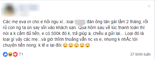 Nguyên văn bài viết của V.T: “Người đàn ông tán gái tầm 2 tháng rồi rủ con người ta uống say vào khách sạn. Đến lúc thanh toán thì nói: “Anh không cầm đủ tiền, em có 500k đó không trả giúp anh! Chiều anh gửi lại”. Giờ thỉnh thoảng vẫn nói chuyện với mình nhưng không nhắc đến chuyện tiền nong, không lẽ mình lại đòi?”.