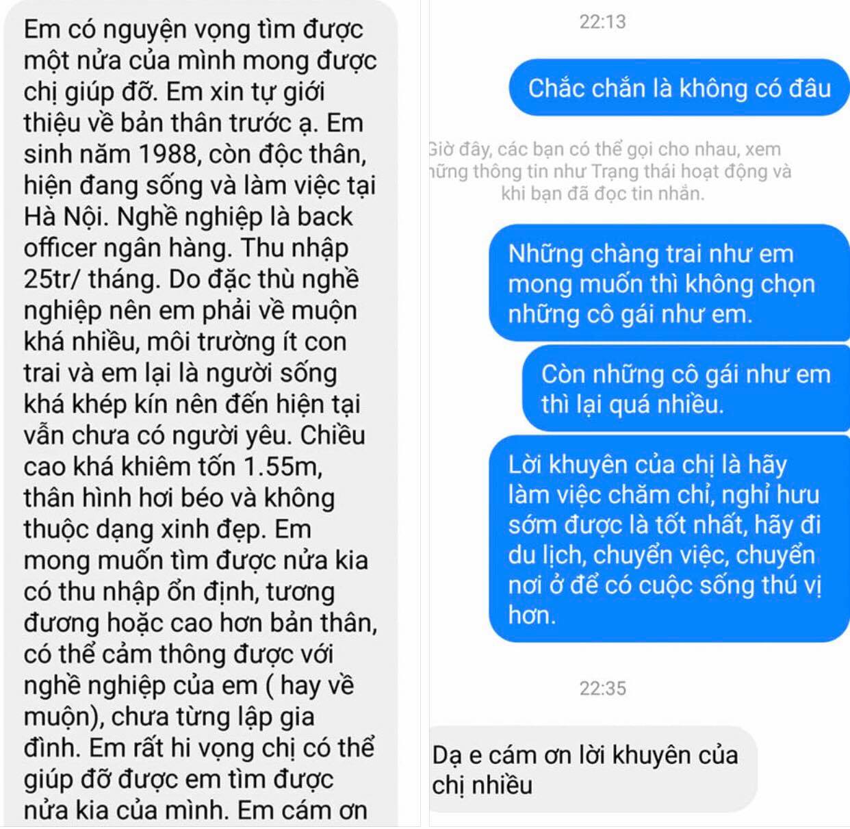 “Em có nguyện vọng tìm được một nửa của mình, mong được chị giúp đỡ. Em xin tự giới thiệu về bản thân trước. Em sinh năm 1988, còn độc thân, hiện đang sống và làm việc tại Hà Nội. Nghề nghiệp là back officer ngân hàng. Thu nhập 25tr/tháng. Do đặc thù nghề nghiệp nên em phải về muộn khá nhiều, môi trường ít con trai và em lại là người sống khá kép kín nên đến hiện tại vẫn chưa có người yêu. Chiều cao khá khiêm tốn 1.55m, thân hình hơi béo và không thuộc dạng xinh đẹp.
