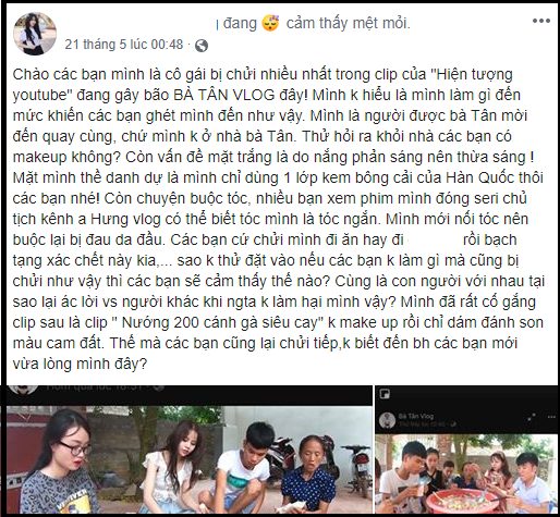 ”Chào các bạn, mình là cô gái bị chửi nhiều nhất clip của bà Tân vlog đây! Mình không hiểu là mình làm gì đến mức khiến các bạn ghét mình đến như vậy. Mình là người được bà Tân mời đến quay cùng chứ mình không ở nhà bà Tân. Thử hỏi ra khỏi nhà các bạn có makeup không? Còn vấn đề mặt trắng là do nắng phản sáng và hắt sáng vào! Mặt mình thề danh dự là mình chỉ dùng 1 lớp kem bông cải của Hàn Quốc thôi các bạn nhé! Còn chuyện buộc tóc, nhiều bạn xem clip mình đóng chủ tịch kênh anh Hưng Vlog có thể biết tóc mình là tóc ngắn. Mình mới nối tóc nên buộc lại bị đau da đầu. Các bạn cứ chửi mình bạch tạng xác chết này kia sao không thử đặt mình vào. Nếu các bạn không làm gì sai mà cũng bị chửi như vậy thì các bạn sẽ cảm thấy thế nào? Cùng là con người với nhau tại sao lại ác lời với người khác khi người ta không làm hại mình vậy? Mình đã rất cố gắng, clip ăn cánh gà mình đã không make up rồi, chỉ dám đánh son màu cam đất. Thế mà các bạn cũng lại chửi tiếp. Không biết đến bao giờ các bạn mới vừa lòng đây?”