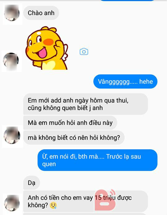 Đề nghị của cô khiến anh chàng há hốc mồm tá hỏa, chỉ có nước sợ chạy mất dép: Hỏi vay 15 triệu đồng. Điều đáng ngạc nhiên là trước đó hai người không quen biết gì nhau và chưa từng nói chuyện lần nào, cô gái cũng mới add facebook của chàng trai một ngày.