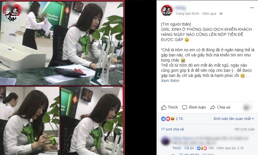 Đầu tuần, tưởng rằng mạng xã hội sẽ toàn là những status tâm trạng uể oải vì áp lực công việc và học tập. Thế nhưng hôm nay, mọi người lại đang vô cùng hào hứng, sôi nổi khi có chàng trai bất ngờ đăng tin tìm info cô nhân viên ngân hàng vô cùng xinh xắn và dễ thương.