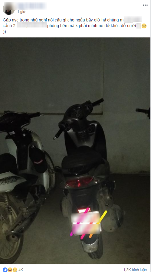 Tài khoản N.T.H đăng đàn hỏi: “Gặp người yêu cũ trong nhà nghỉ, nói câu gì cho ngầu hả mọi người?”. Kèm với tình huống dở khóc dở cười này, anh bạn đăng ảnh chụp chiếc xe máy được cho là của người yêu cũ.