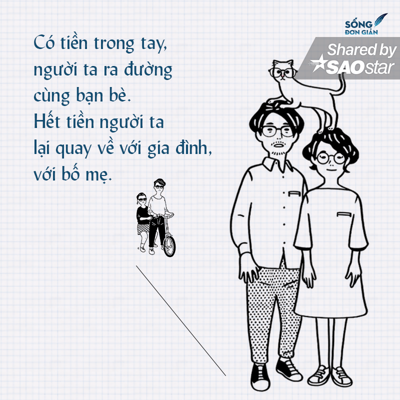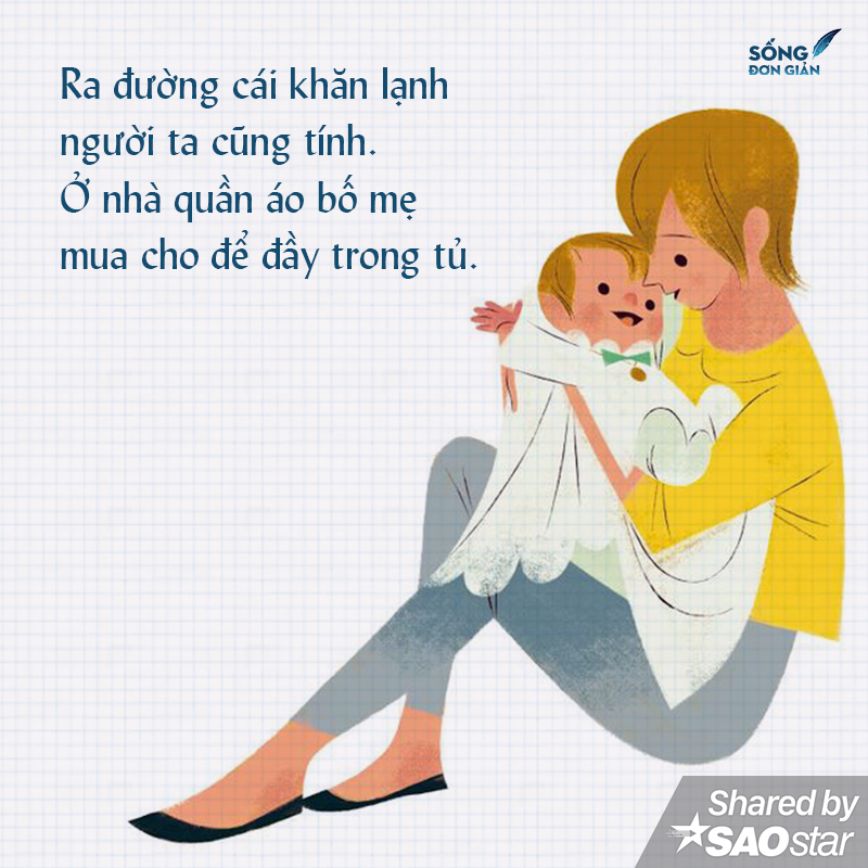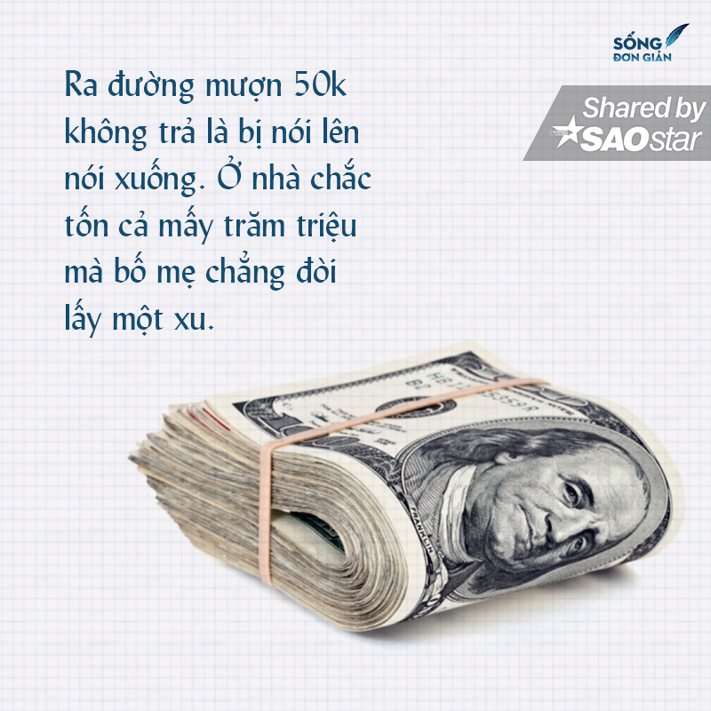 Và rồi rất nhiều điều khác nữa, việc kiếm tiền lại trở thành một vấn đề quan trọng và cấp thiết, vì lo cho chúng ta ăn uống, đi học, đi chơi và sắm sửa cho bằng bạn bằng bè. Chỉ cần không cho là bạn lại vô tình mở miệng nói lời 'cay đắng' khiến mẹ bật khóc, ba đau lòng. 'Mẹ không thương con như nhà người ta.' Nhưng bạn đâu có nhận ra một sự thật từ cuộc đời, rằng ở nhà, chắc tốn cả mấy trăm triệu nhưng ba mẹ không đòi một xu. Nhưng ra đường, mượn 50 nghìn mà không trả, bị người khác nói lên nói xuống.