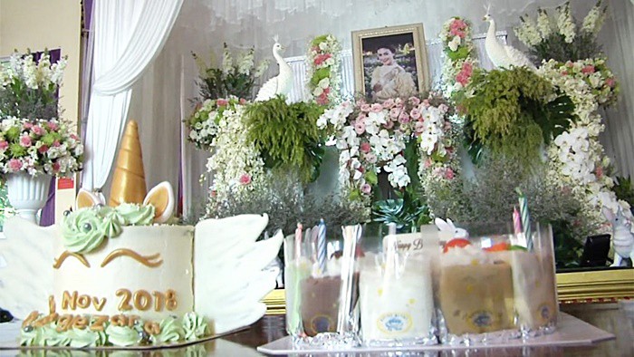 Rất đông bạn bè của Nursara đã có mặt ở buổi tiệc đặc biệt này, để cầu nguyện những điều an lành nhất cho nữ diễn viên hồng nhan bạc mệnh. Trong bữa tiệc, bánh ga tô và hoa, nến được đặt trước linh cữu của người đẹp. Một chú gấu màu vàng như một món quà sinh nhật được bạn thân gửi tặng cô.