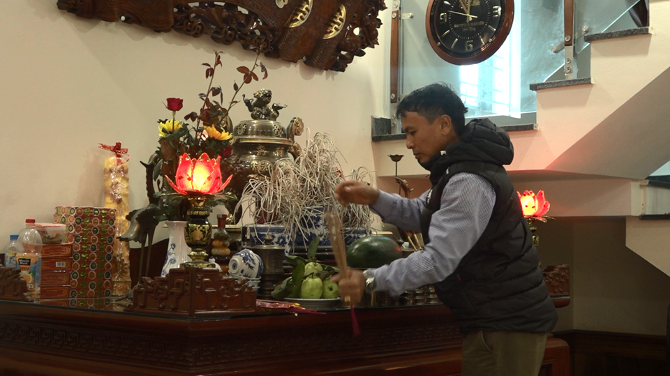 Trước trận đấu, ông Nguyễn Quang Thuần, bố cầu thủ Quang Hải thắp hương khấn gia tiên mong con và đồng đội thi đấu thật tốt.