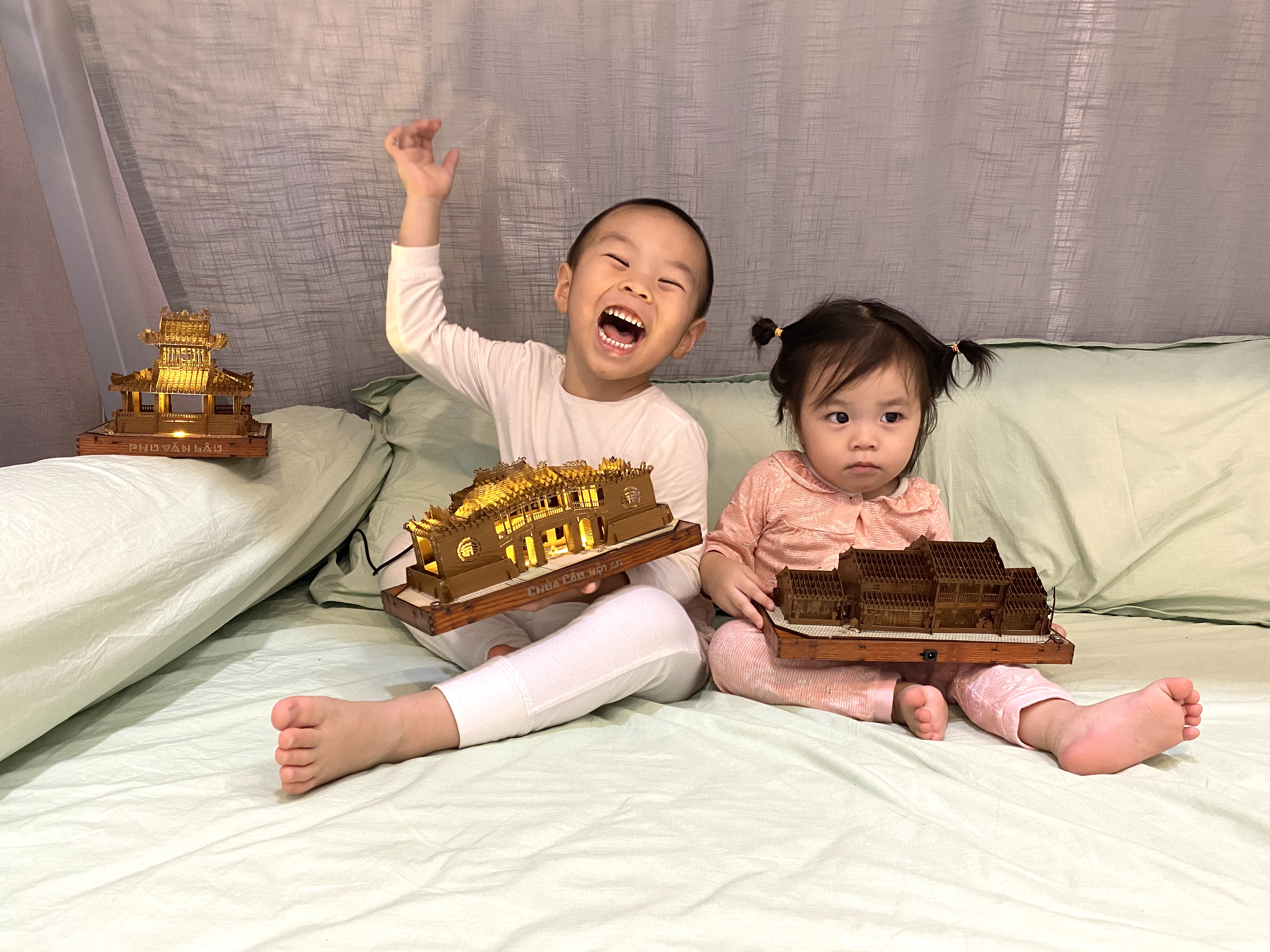 Vào buổi tối, gia đình “dính một cục” tiếp tục quây quần bên nhau để chơi một số trò chơi và cùng xem tivi các chương trình thiếu nhi. Trước khi đi ngủ, ca sĩ Ngọc Mai còn cùng các con ngắm những di tích đẹp mà mình đã sưu tầm trước đó. 2 bé vừa học vừa chơi rất thích thú, nhất là khi được nghe mà má Ngọc Mai kể những câu chuyện xoay quanh các mô hình di tích này.