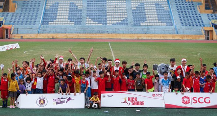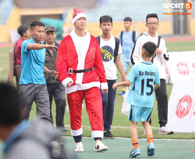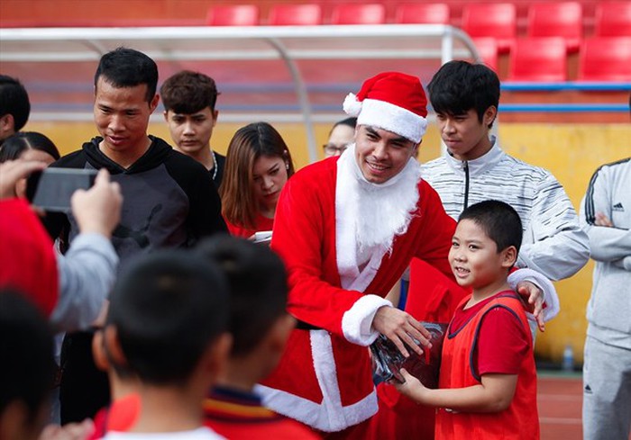 Duy Mạnh cùng Đức Huy hóa ông già Noel phát quà cho trẻ em đam mê đá bóng tại SVĐ Hàng Đẫy
