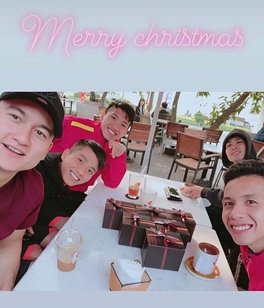 Trên Instagram của Hồng Duy, 5 chàng trai của ĐTVN bao gồm: Văn Lâm, Phan Văn Đức, Đoàn Văn Hậu, Công Phượng và chủ nhân bức ảnh quây quần bên nhau tại một quán cafe cùng những hộp quà đẹp mắt. Tuy nhiên, không phải người đăng ảnh đẹp nhất mà Lâm Tây khiến fan nữ điêu đức vì đẹp như tượng tạc, còn Công Phượng lại giấu đi quả “tóc súp lơ”.