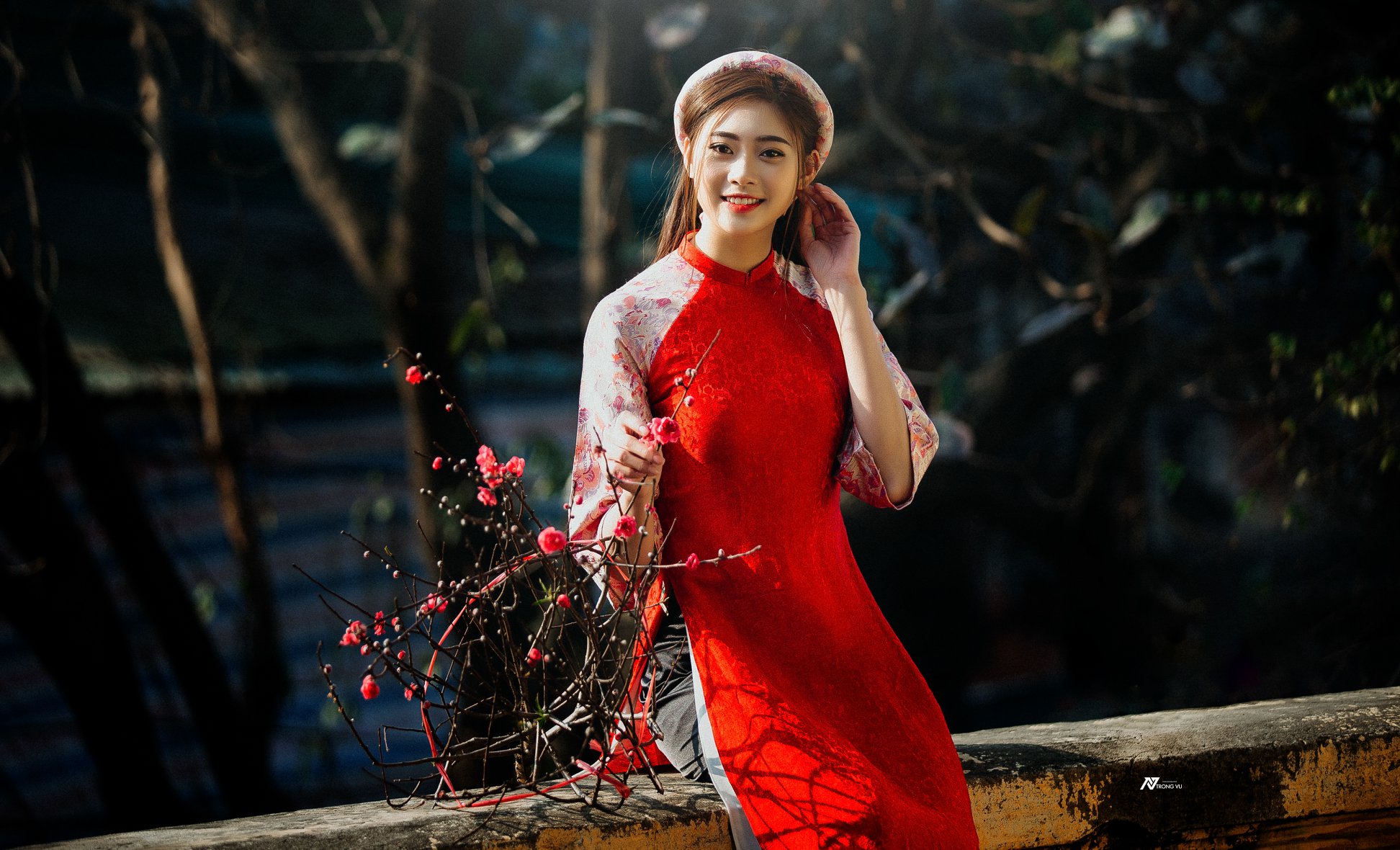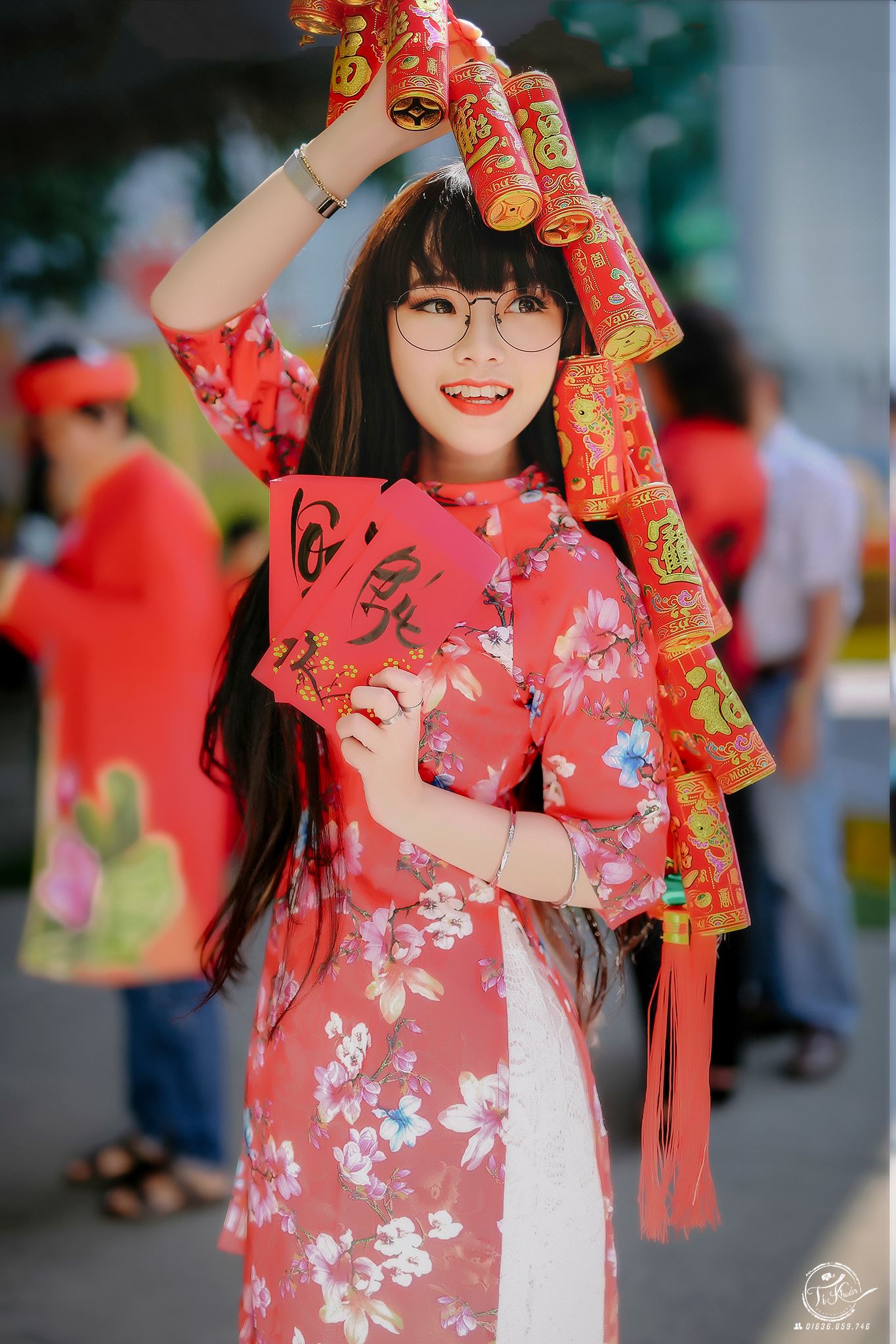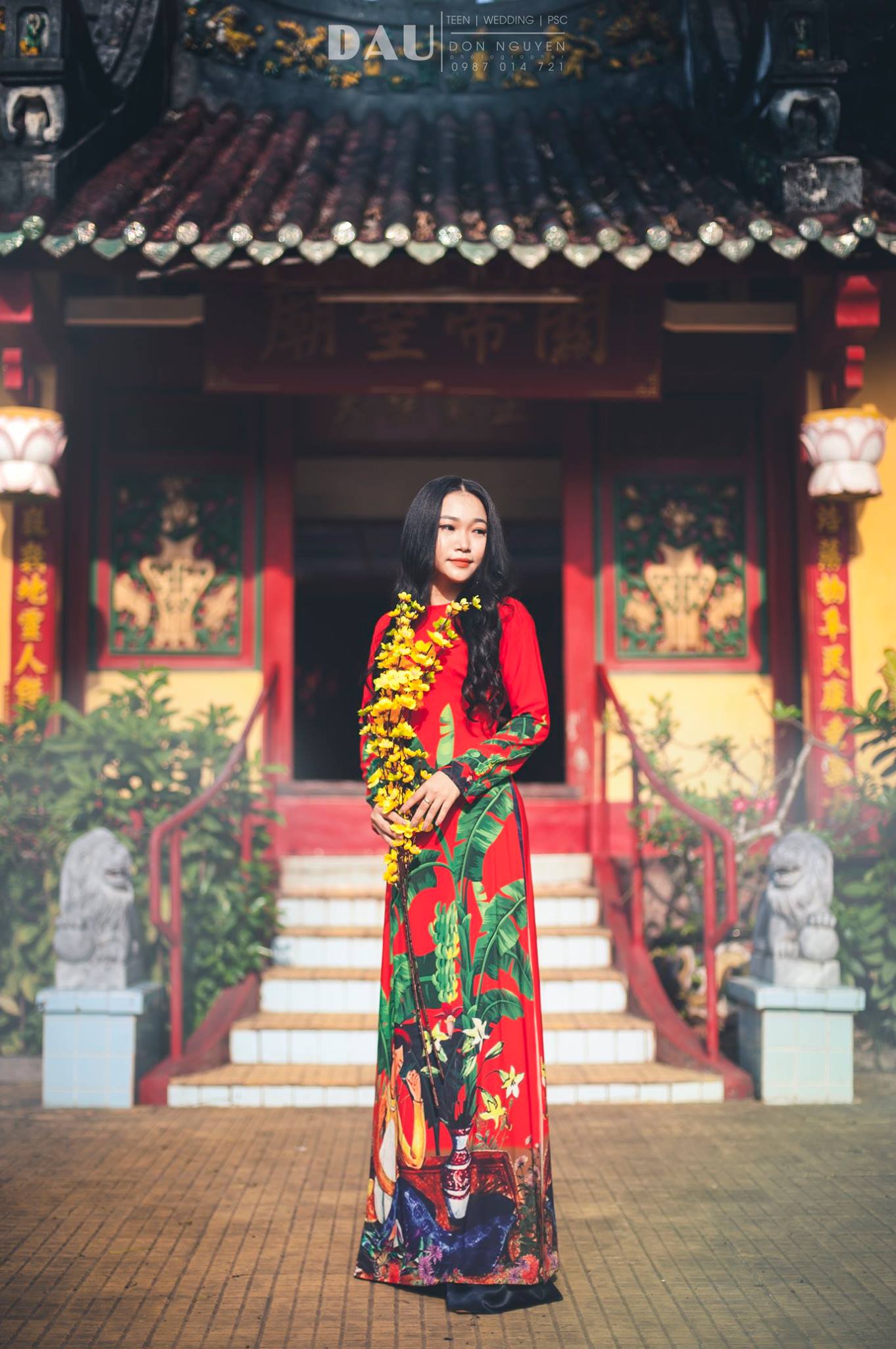 Áo dài màu đỏ được các bạn gái ưa chuộng hơn cả. (Ảnh: Trọng Vũ)